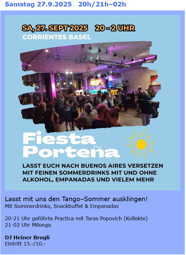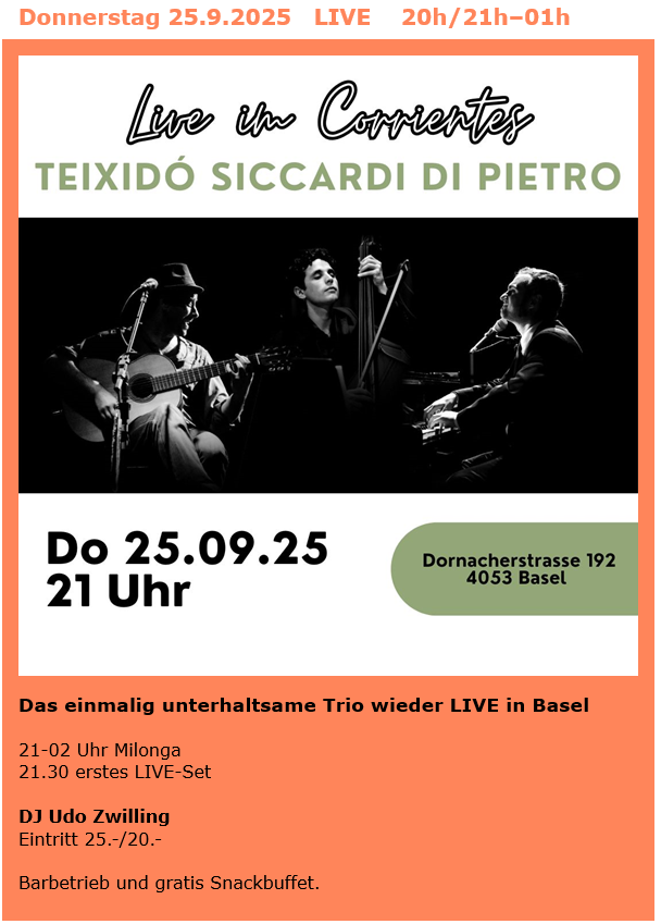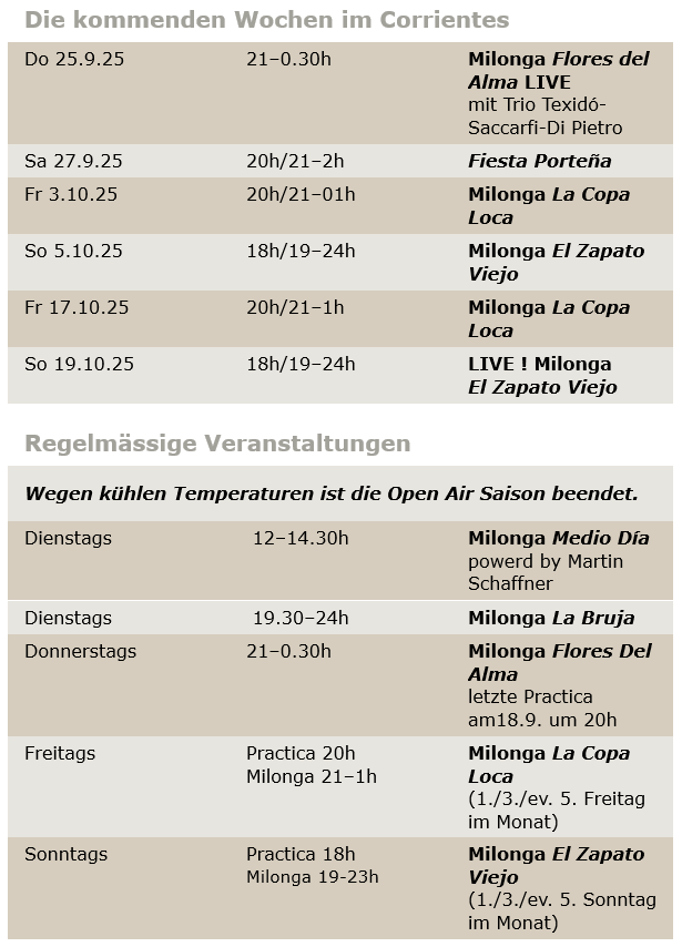 Ausschreibungen aktueller Tango–Kurse rund ums Corrientes