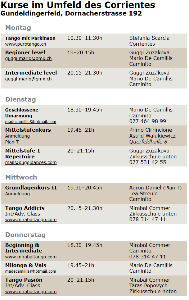 Ausschreibungen aktueller Tango–Kurse rund ums Corrientes